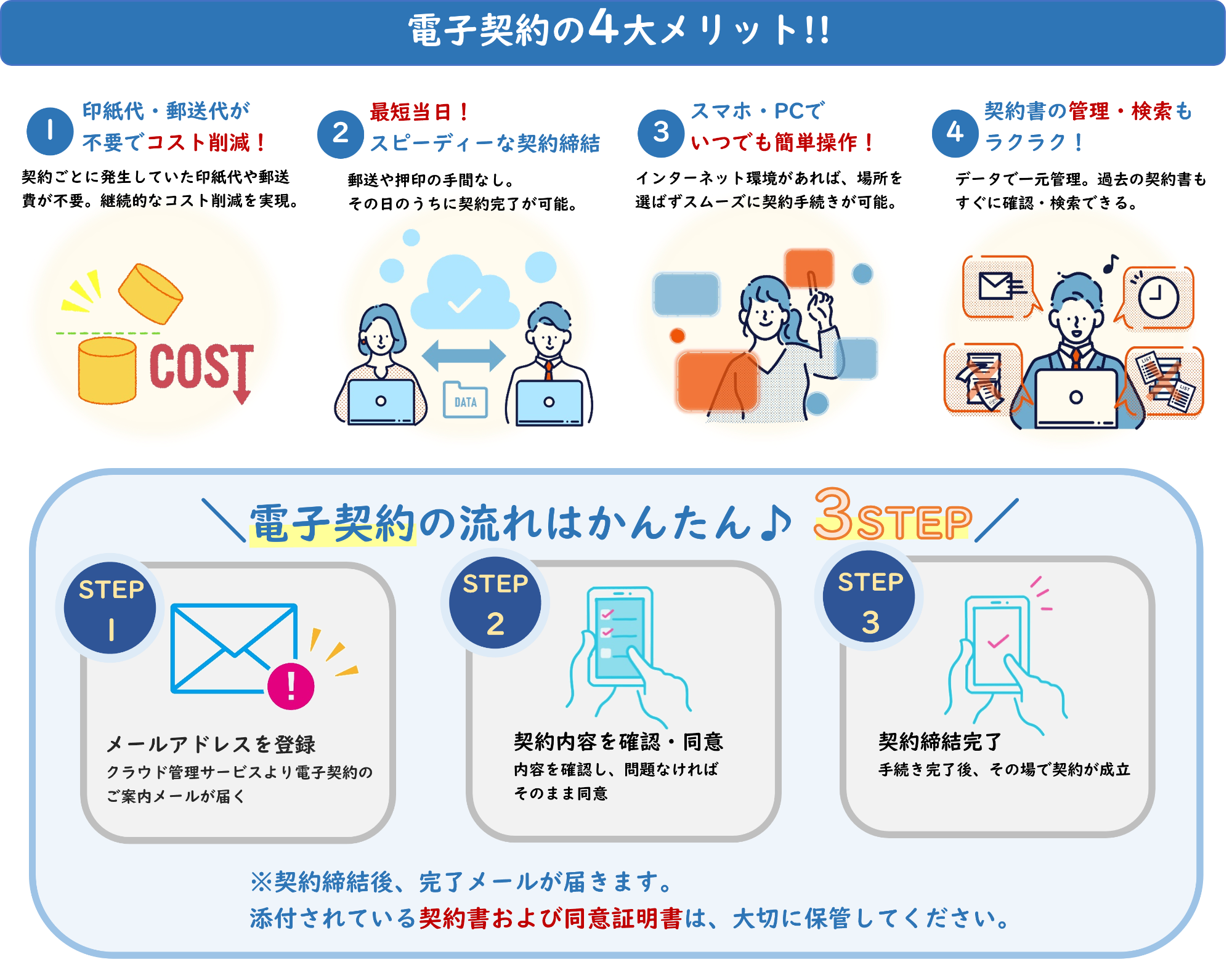締結後、締結完了メールが届きますので、添付されている契約書・同意証明書を大切に保管ください。