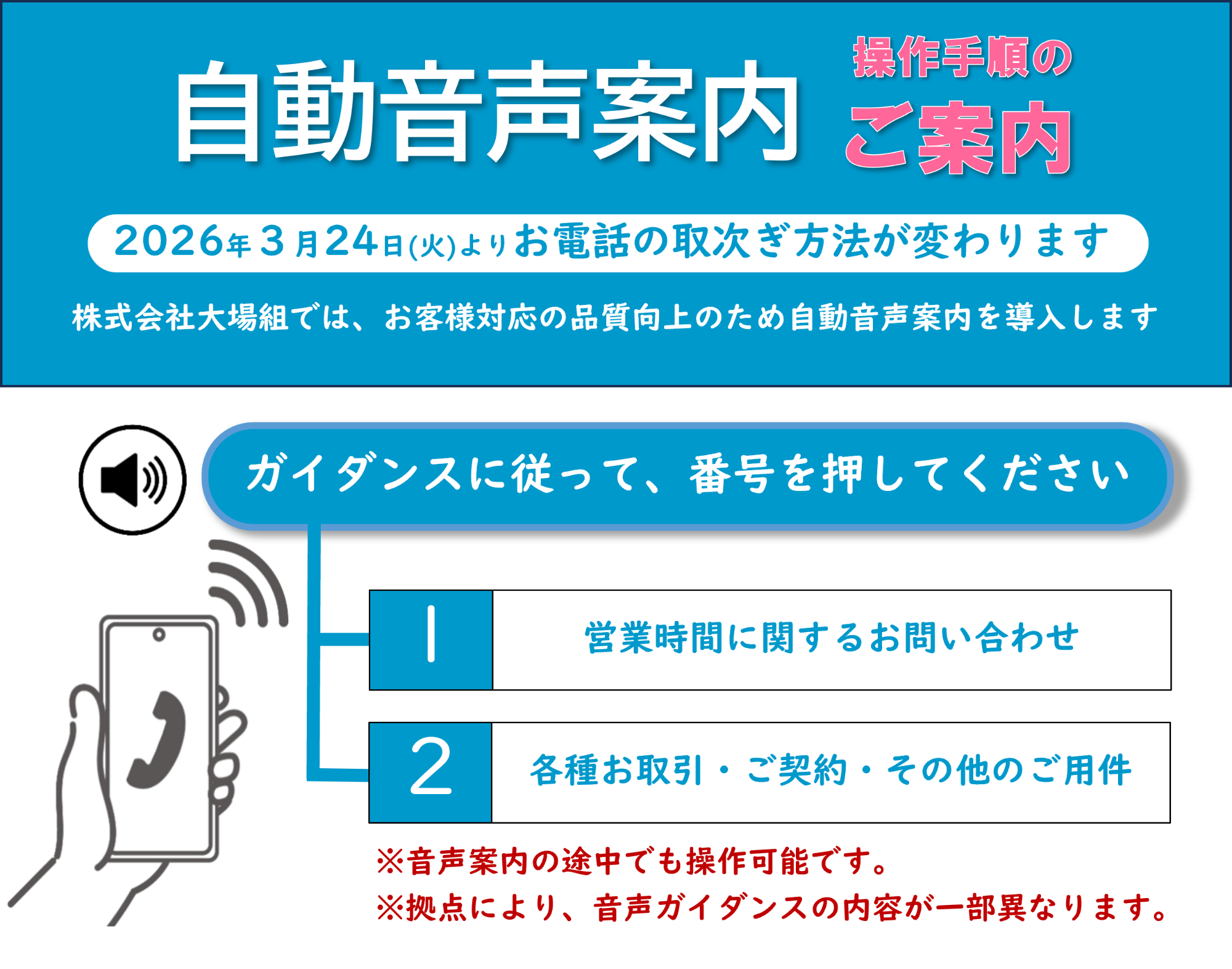 株式会社大場組では、お客様対応の品質向上および円滑なご案内のため、